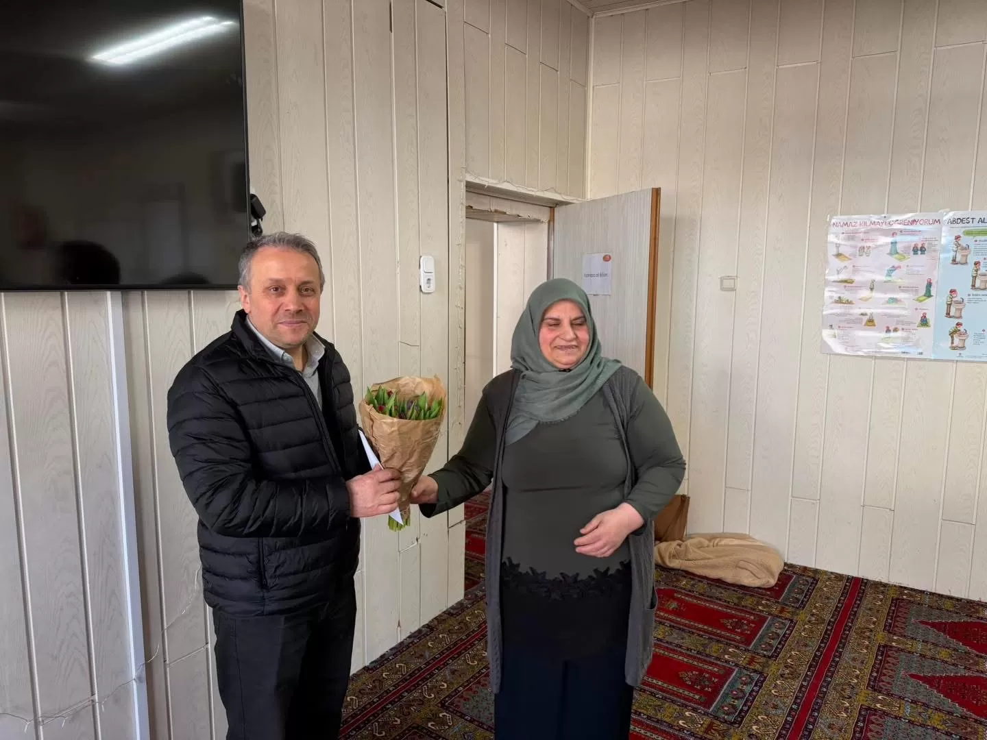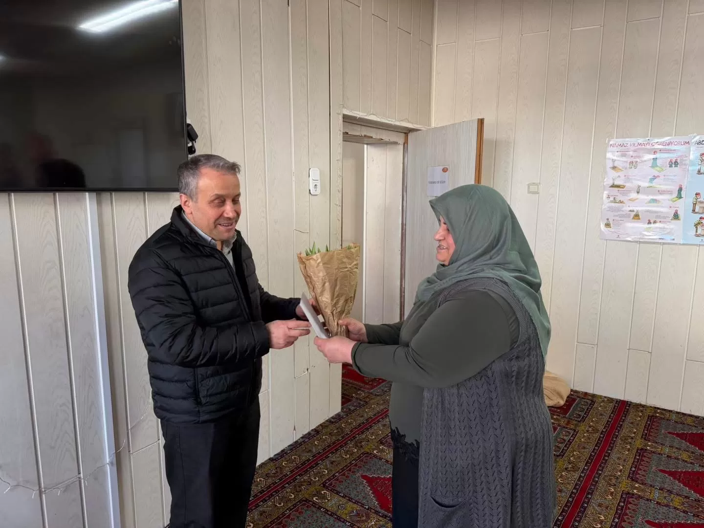 Camimizde okunan son cümleyle birlikte bu seneki mukabelemizi tamamlamış olduk. Hanımefendiler, hocamızın Ramazan ayı boyunca gösterdiği özverili gayretlerinden dolayı kendisine teşekkür ederek çiçek takdim ettiler. Hocamız da nazik jestleri için kendilerine teşekkür etti ve okumuş olduğumuz mukabelenin Allah katında kabul olmasını niyaz etti. Ayrıca, Rabbimizin bizlere gelecek yıl da yeniden bir araya gelip mukabele okumayı nasip etmesini diledi.